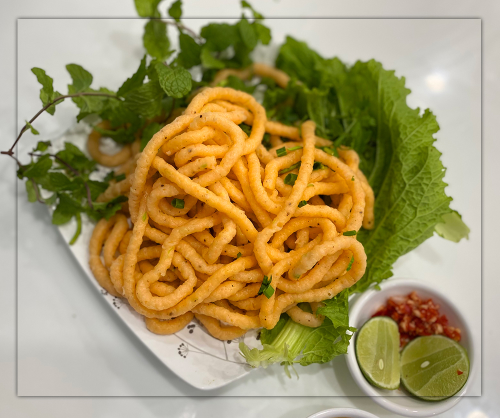 Con Suông tên nghe lạ lạ hiếu kỳ, nhưng thật sự đến từ món ăn Bún suông là một món có nguồn gốc từ Trà Vinh mang đậm hương sắc của miền Tây. Bún suông hấp dẫn người thưởng thức với chất dân dã và đậm đà của nước lèo rất riêng từ sự kết hợp các nguyên liệu dễ tìm, quen thuộc trong đó có thành phần chính Con Suông, Con Suông được làm từ tép tươi bóc tách vỏ tách cả chỉ đen cho sạch, cho ít bột, hành lá tiêu đen quết nhuyễn sau đó nặng con suông sợi dài trên nồi nước 100⁰C, Nếu là con suông đạt chuẩn sẽ nổi lên ngay, con suông bằng đầu đủa màu vàng ống sợi con suông dài không đứt khúc “Suông sẽ” mọi thứ tốt đẹp phong thuỷ món ăn nghe tên gọi đã may mắn Bún Suông vị ăn thanh đạm sẽ theo bạn