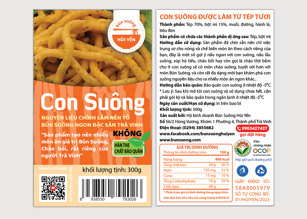 Những mẫu tem nhãn chính thức của Con Suông, phổ thông từ 100g, 300g, 500g, 1.000g